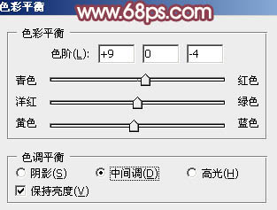 13、创建色彩平衡调整图层,对中间调,高光进行调整,参数设置如图34,35,效果如图36。这一步给图片增加橙黄色。