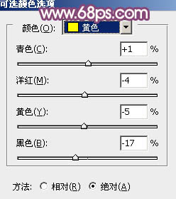 4、创建可选颜色调整图层,对黄,白进行调整,参数设置如图15,16,效果如图17。这一步适当把图片中的黄色调淡,并加强高光部分的颜色。