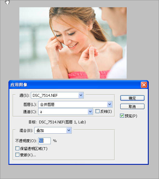 3、选择图像-应用图像-混合为叠加-不透明度为50%,来计算(根据照片的艳度才去决定不透明度值是多少)计算完后我们可以看照片肤色比较艳丽而且红润这正是LAB与应用图像的特别之处。