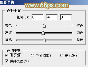 8、创建色彩平衡调整图层,对阴影,高光进行调整,参数设置如图23,24,效果如图25。这一步加强图片暗部及高光部分的颜色。