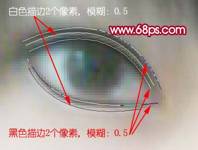5、双眼皮的制作。有很多教程都说过。这里我简单介绍一下。选择画笔工具,笔刷大小设为2像素,前景颜色设置为黑色,用钢笔工具勾出图9所示路径,右键选择路径描边,选择画笔,可以不勾选模拟压力。确定后执行:滤镜 > 模糊 > 高斯模糊,数值为0.5,同样方法勾其它路径如图10,效果如图11。效果有点恐怖,主要是眼珠部分还没有做好,后面再处理。