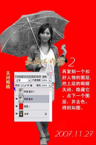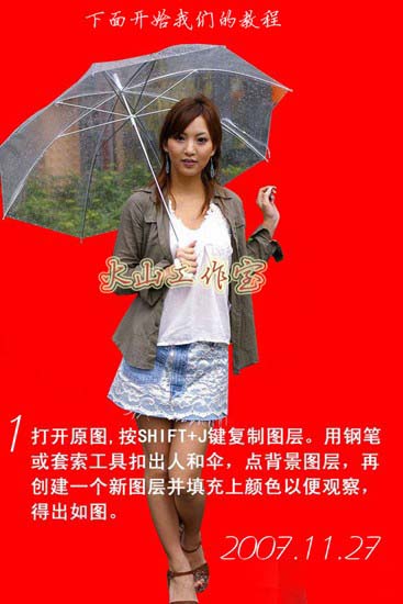 1、打开原图,按Ctrl + J把背景复制一层,用钢笔或套索工具抠出人和伞,在背景图层上面新建一个图层,填充红色以便观察。