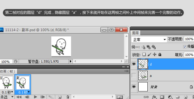 6、第二帧对于的图层“d”完成,隐藏图层“a”,接下来就开始在这亮帧之间补上中间帧来完善一个完整的动作。
