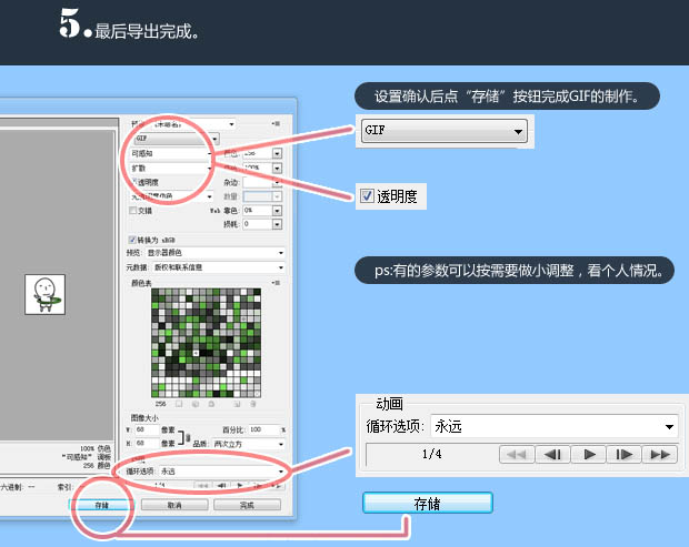 9、在弹出的面板好参数后,点“存储”按钮完成GIF的制作。