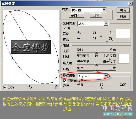 12、设置光照效果参数如图示,观察预览框里的图像,调整光线形状,注意不要过亮,稍暗些效果好,图中椭圆形状供参与,纹理通道选alpha1,其它项保持默认确定退出。