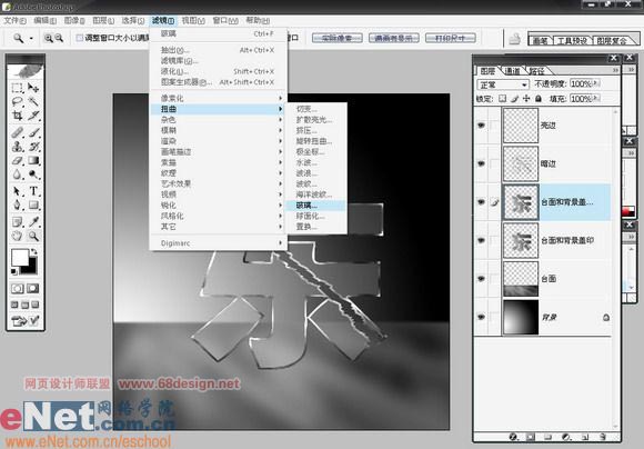 十四、再复制一次“台面和背景盖印”层,并对其使用扭曲/玻璃滤镜,并降低其不透明度。