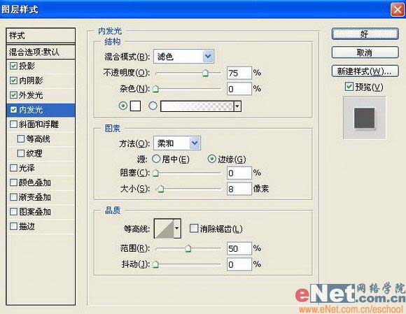 “内发光”图层样式,设置参数如图14: