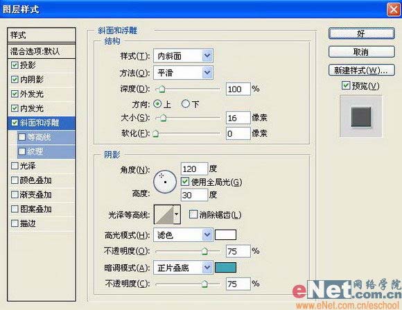 “斜面和浮雕”图层样式,设置参数如图15: