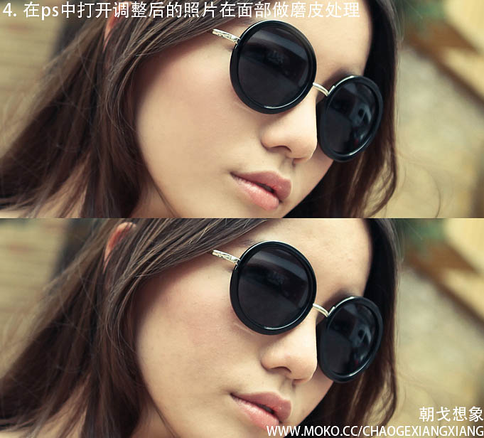 4、在PS中打开调整后的照片,在面部做磨皮处理。
