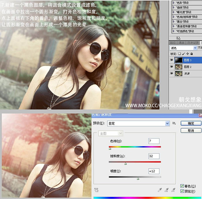 7、新建一个黑色图层,将混合模式设置成“滤色”,在画面中拉出一个圆形渐变,打开色相饱和度点上面板右下角的“着色”,调整色相、饱和度和明度,让圆形渐变在画面上形成一个漂亮的光晕。