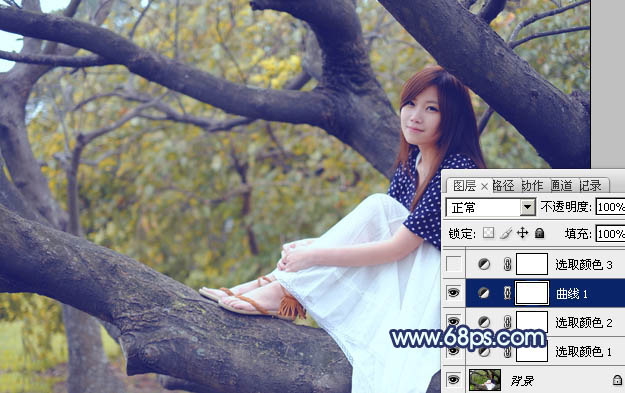 Photoshop制作坐树枝上的蓝黄色小清新美女照片