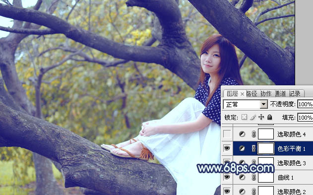 Photoshop制作坐树枝上的蓝黄色小清新美女照片
