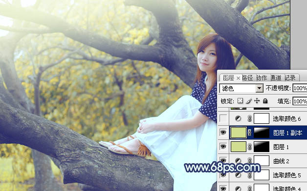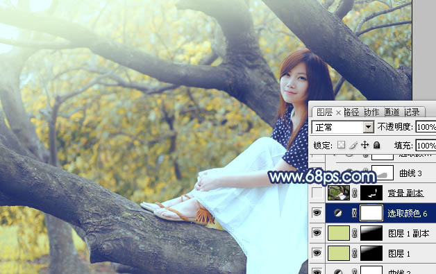 Photoshop制作坐树枝上的蓝黄色小清新美女照片