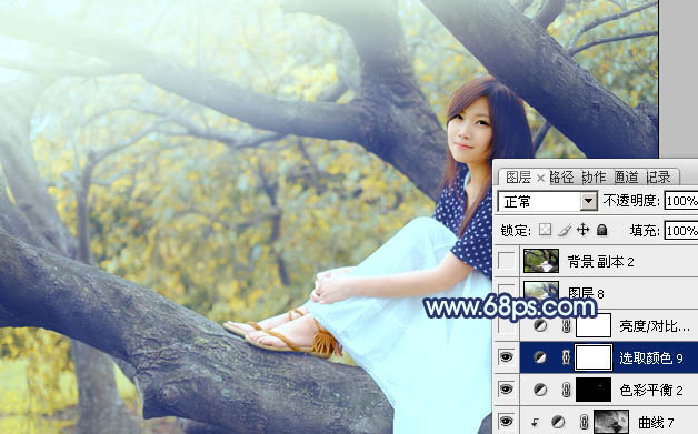 Photoshop制作坐树枝上的蓝黄色小清新美女照片