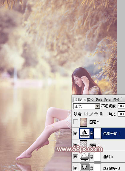 8、创建色彩平衡调整图层,对阴影,高光进行调整,参数设置如图21,22,确定后把不透明度改为:20%,效果如图23。这一步微调图片暗部及高光部分的颜色。
