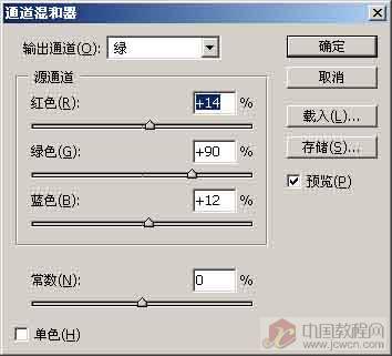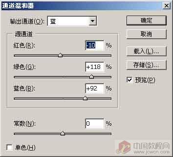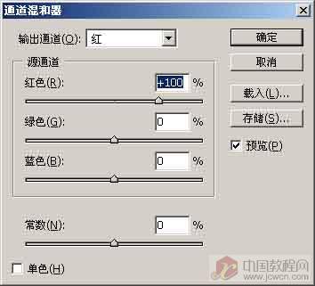 下面打开通道混合器,也许很多人会奇怪,什么是输出通道是什么,原通道又是什么?输出通道就是你要修改的通道,源通道可以理解为向你要修改的通道(输出通道)中添入的另外两个通道的成分。也许现在不明白,没关系,下面就会明白了。也许你还奇怪为什么源通道中的红色为什么是100%,这个问题关系到RGB原理构成,我就不跑题了。
