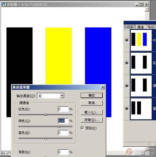 继续我们的话题。源通道选择绿色,并调到100%。咦?图像怎么又亮啦?这时相当于在红色通道中添加了绿色通道的白色部分。因为进行的是100%的操作,所以这步相当于用绿色通道来替换红色通道,通过通道调板可以看到这一切。补充:在RGB图上,原来绿色的部分变成了黄色,是因为红+绿=黄的原因。