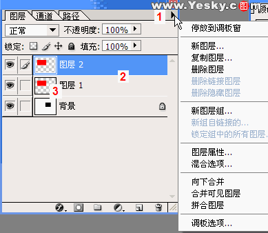图1中显示出了图层面板最简单的功能,1是图层的菜单功能,点击向右的菜单就可以看到它的功能,包括:新建、复制、删除图层,建立图层组,图层属性,混合选项,图层合并等等功能。2就是图层,3是可以看到图层上图像的缩略图。