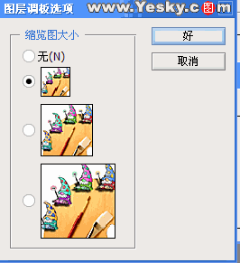 在Photoshop中在“窗口”菜单下选择“图层”就可以打开上面的面板,如果想改变图1中3缩略图的大小可以,点击1的三角形按钮展开功能菜单选择“调板选项”打开选择对话框(图2),然后设置缩略图的显示大小了。
